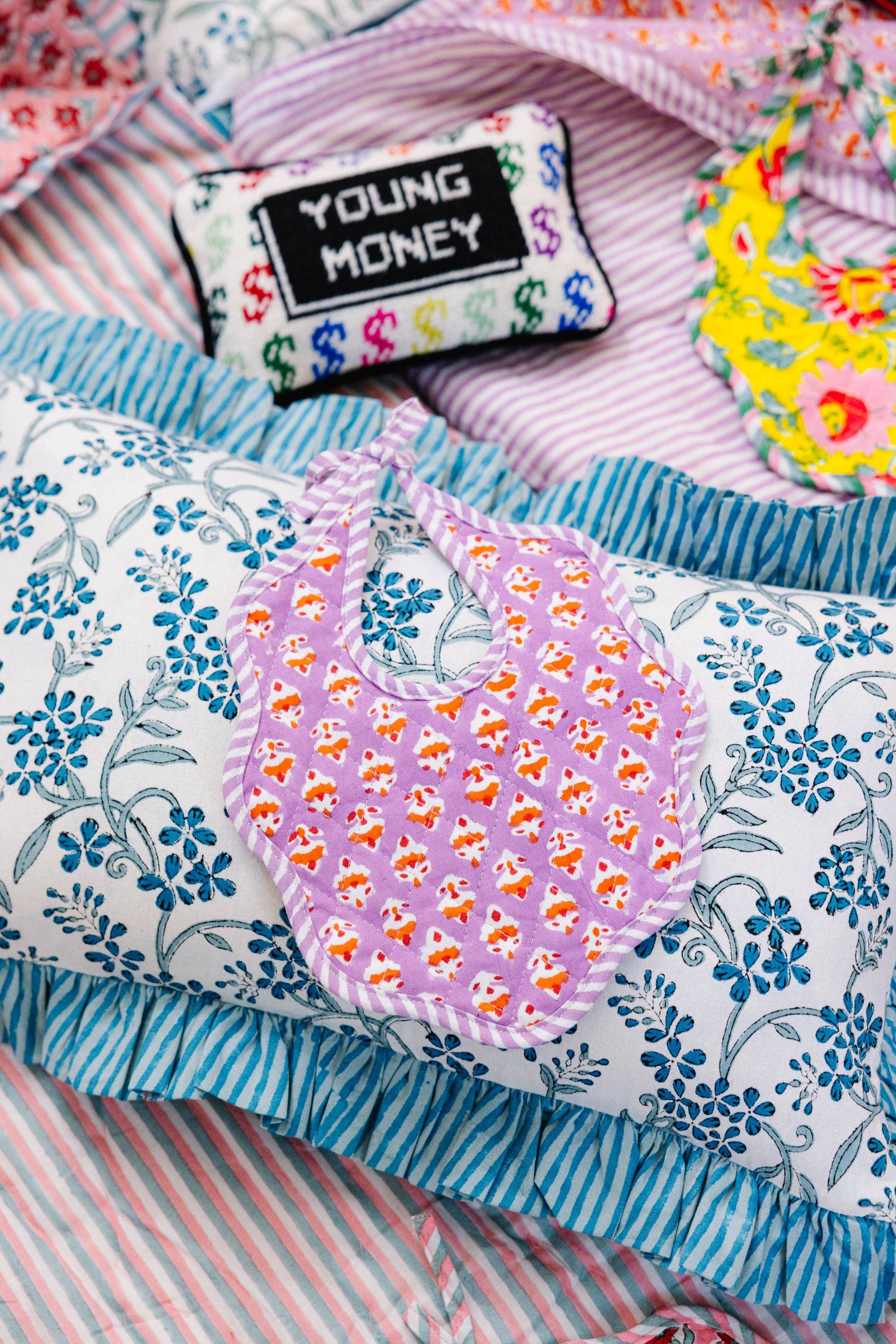 This charming blockprint bib makes mealtime extra-cheery. Pair it with a matching baby quilt for the perfect gift.