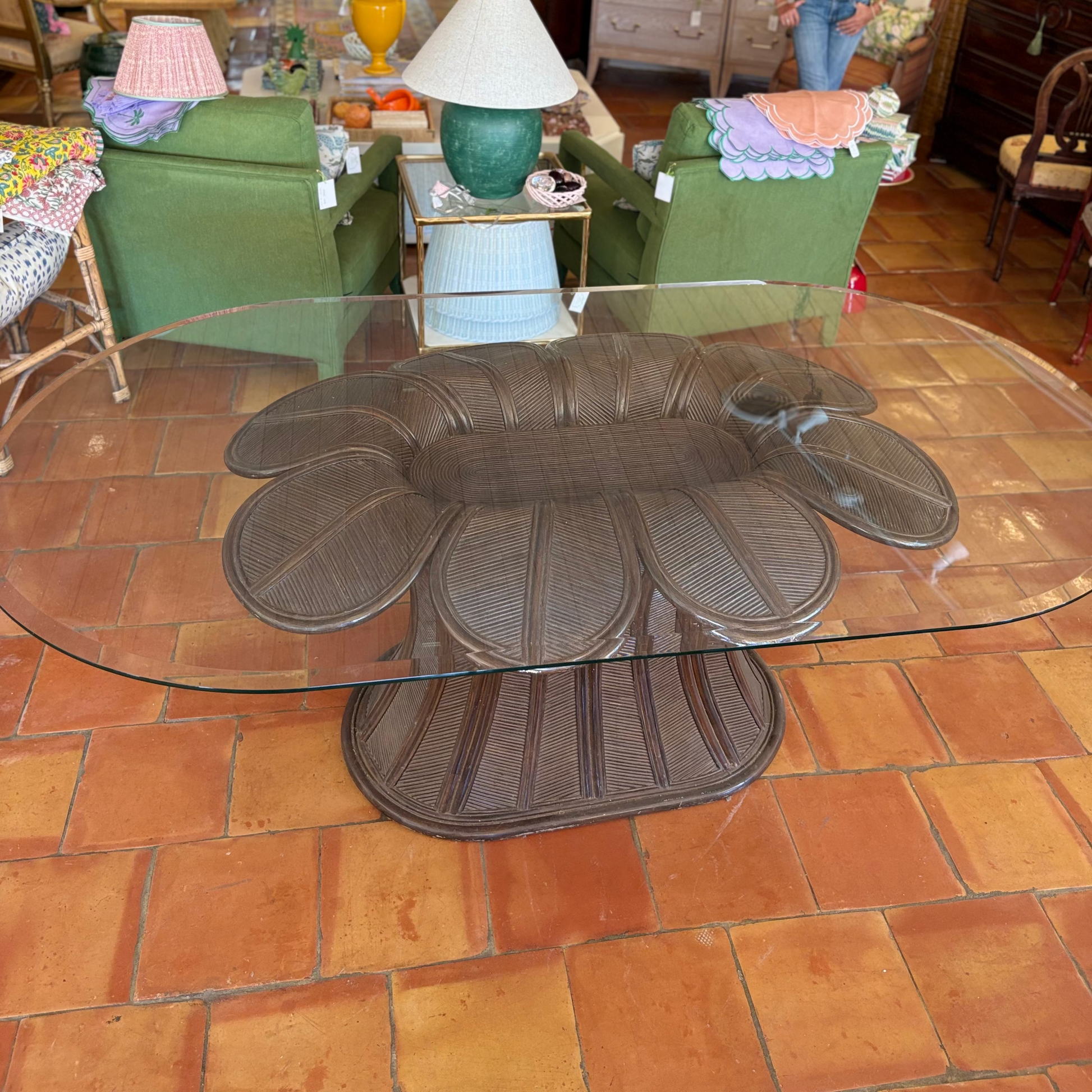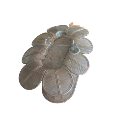 Bamboo and rattan dining table with oval glass top. From above, the beautiful base looks like a flower. In vintage condition with traces of use at the base. Glass top included.