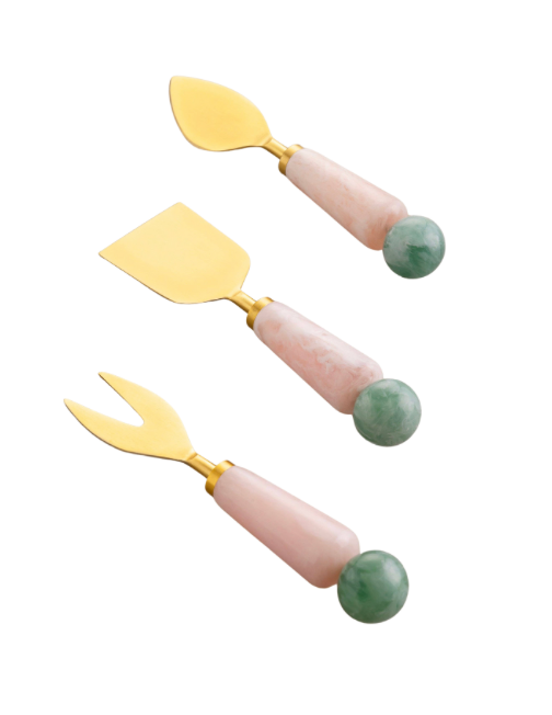 Measurements: 7" x 2" Materials: Stainless steel and resin Colors: Multicolored, matte gold Package: Set of 3. To preserve the natural luster, periodically wipe with a soft cloth.