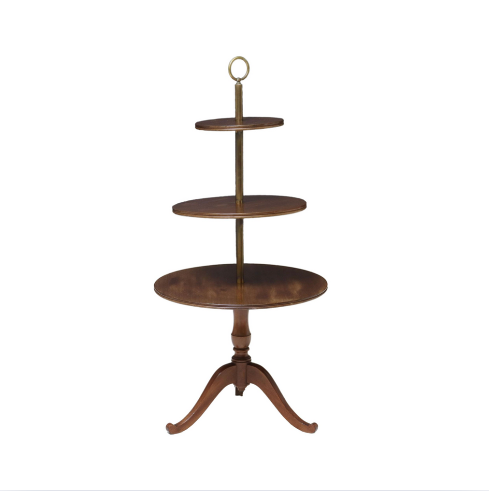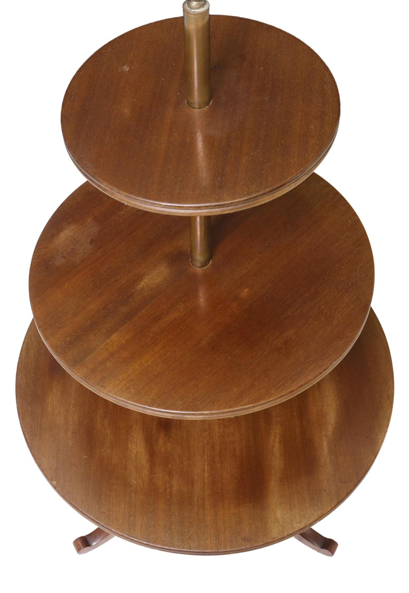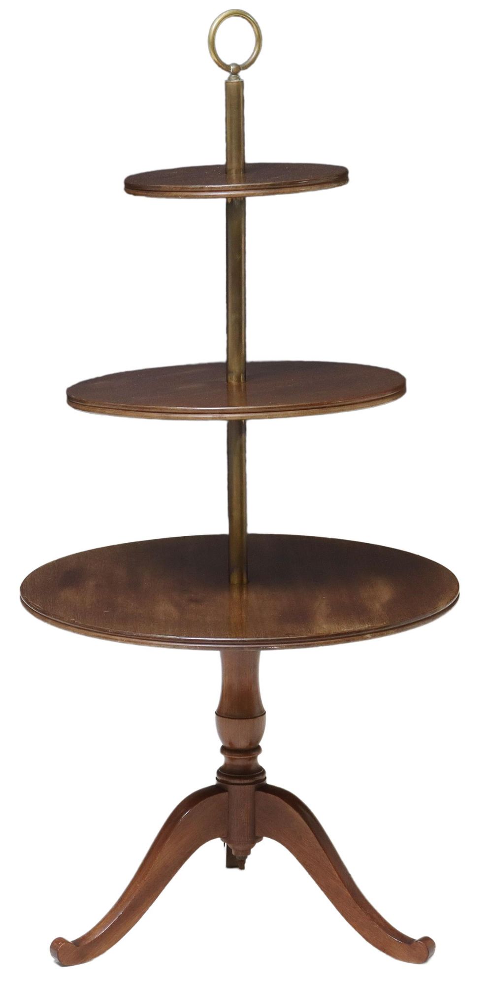 French mahogany three-tiered stand/ side table, 20th c., graduated circular tiers, with gilt metal standard, rising on turned support, ending in tripartite curved legs.