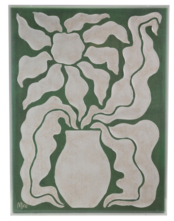 Hand-Painted Acrylic Box Framed Canvas Wall Décor w/ Flower in Vase, Green & White.
