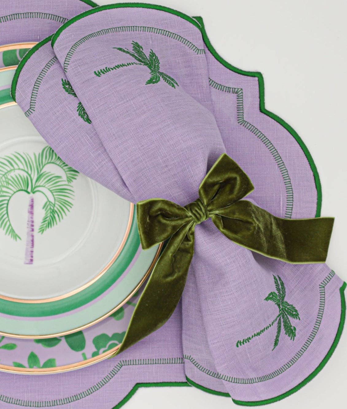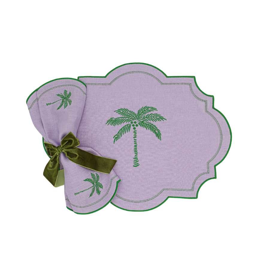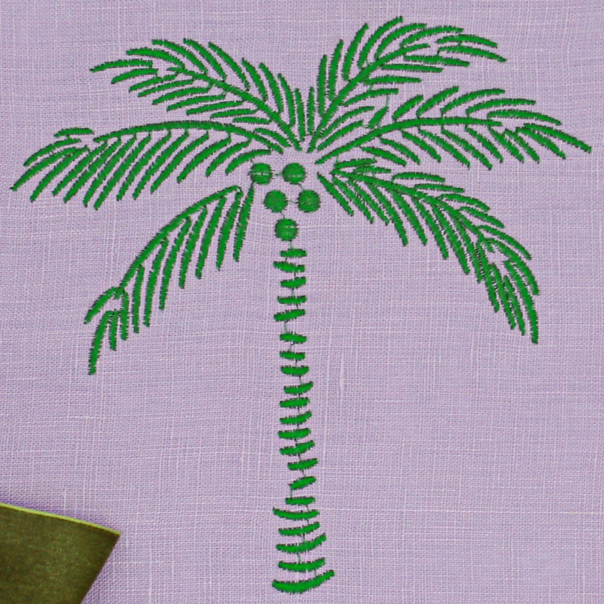 lilac linen with emerald green embroidered edging and palm tree motifs on either side