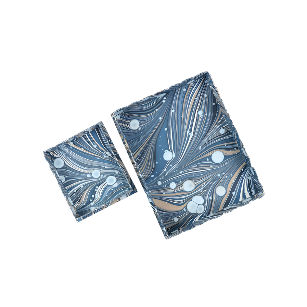 Description : A perfect space for extra pencils, small notes. Suitable for desk spaces, the table next to your front door, bedside table, anywhere that requires a little organizing. Recycled Cotton Handmade Paper Tray Sets are made by Master Artisans who have been creating vintage style boxes and cartonage products for generations in Jaipur. The Paper design is Hand Marbled. Produced in Small Batches only. Designed to Inspire a home filled with Artisanal Slow Living Objects. Set of Nested Small and Large Tray Size : 12" x 9.5" x 1.5" Material : 100% Recycled Cotton Paper