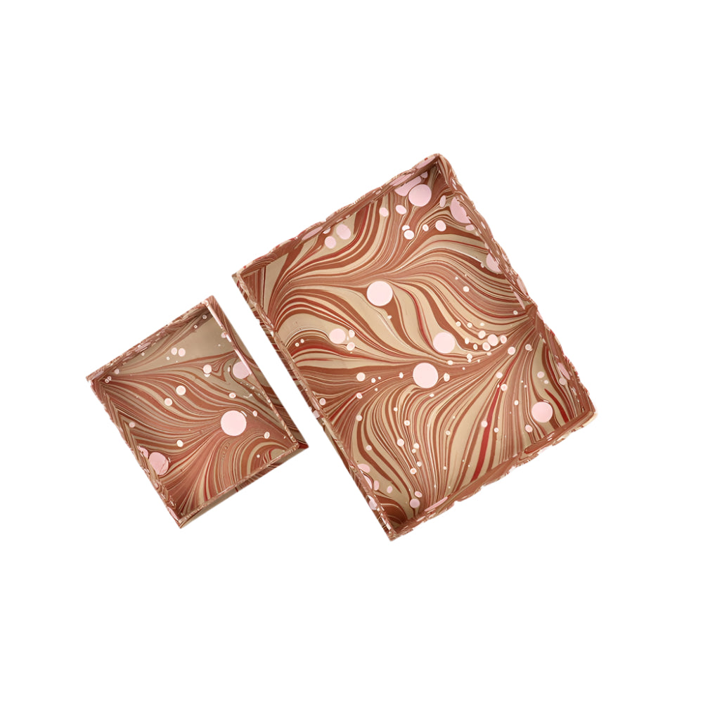 A perfect space for extra pencils, small notes. Suitable for desk spaces, the table next to your front door, bedside table, anywhere that requires a little organizing. Recycled Cotton Handmade Paper Tray Sets are made by Master Artisans who have been creating vintage style boxes and cartonage products for generations in Jaipur. The Paper design is Hand Marbled. Produced in Small Batches only. Designed to Inspire a home filled with Artisanal Slow Living Objects. Set of Nested Small and Large Tray Size : 12" x 9.5" x 1.5" Material : 100% Recycled Cotton Paper