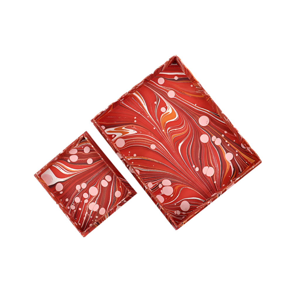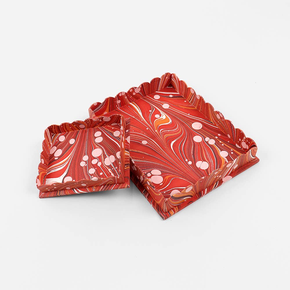 MARBLED SCALLOPED TRAY SET FIRE WHIRL RED