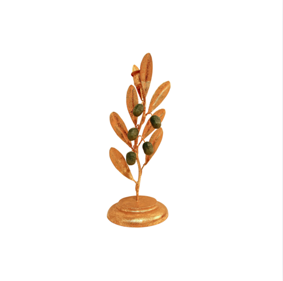 Transform your dining experience with this stunning sculptural candle holder, adorned with gold leaves and olives. Ideal for dinner parties or as a statement piece in your home, it adds a delightful and elegant charm that is absolutely enchanting.