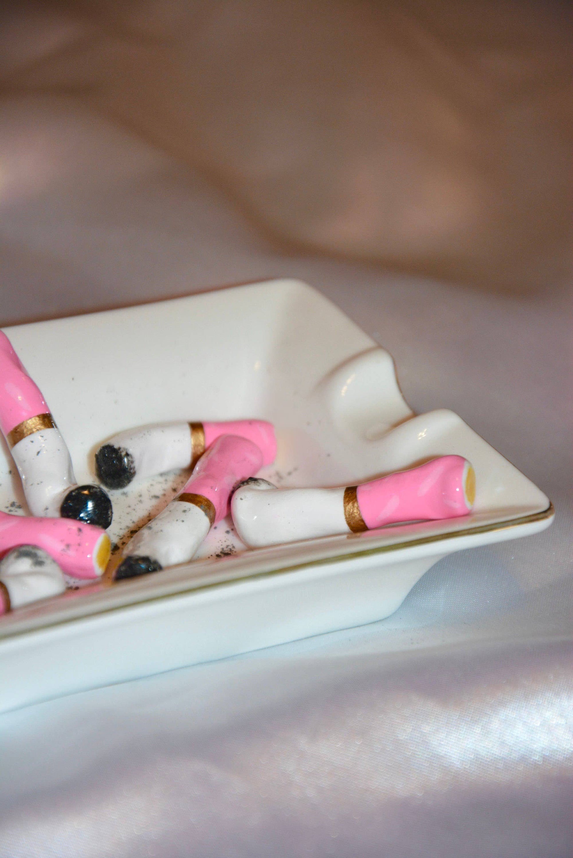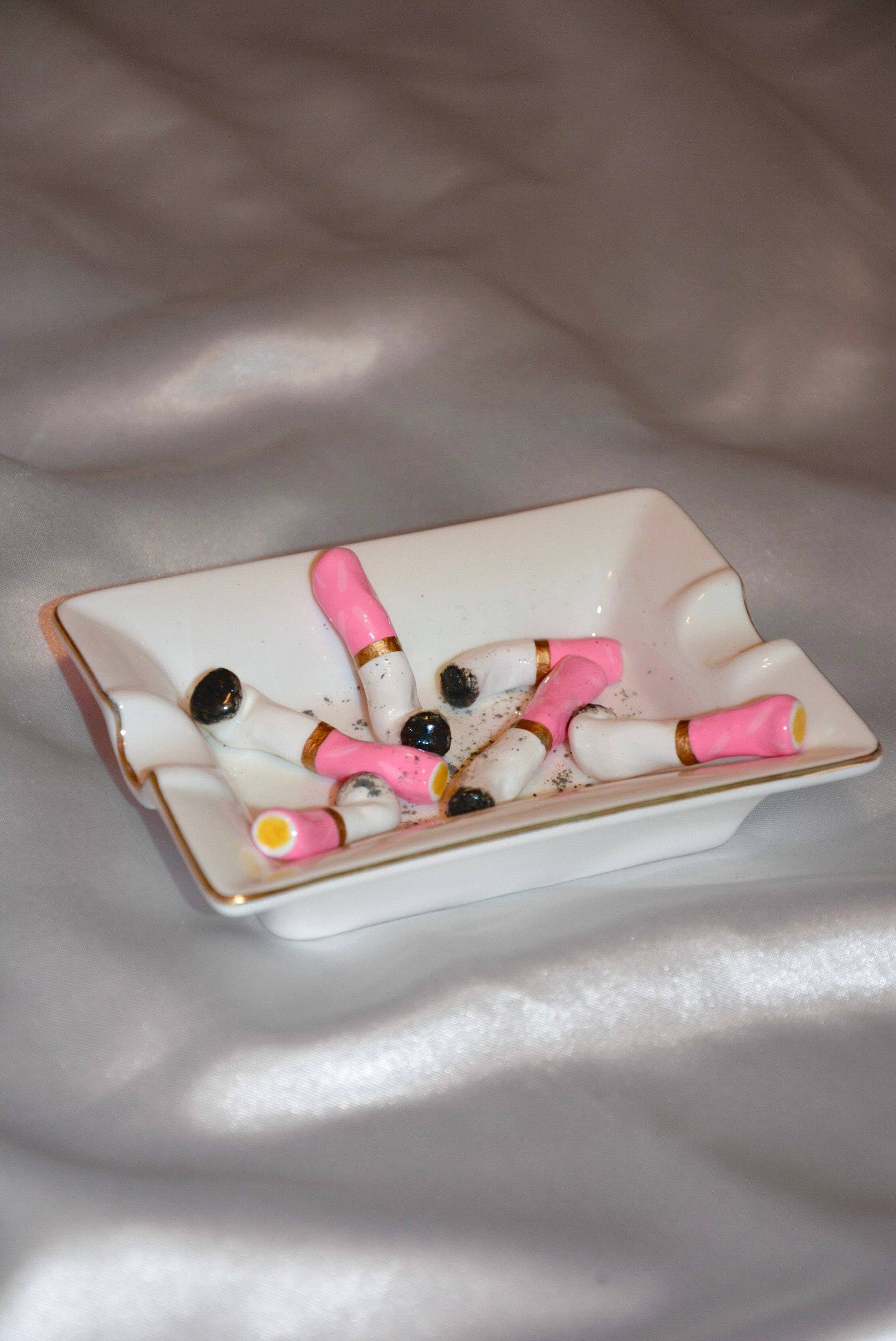 Materials: Ceramic vessel/Ceramic cigarettes/Resin/Metallic gold/Real ashes/Gloss coating