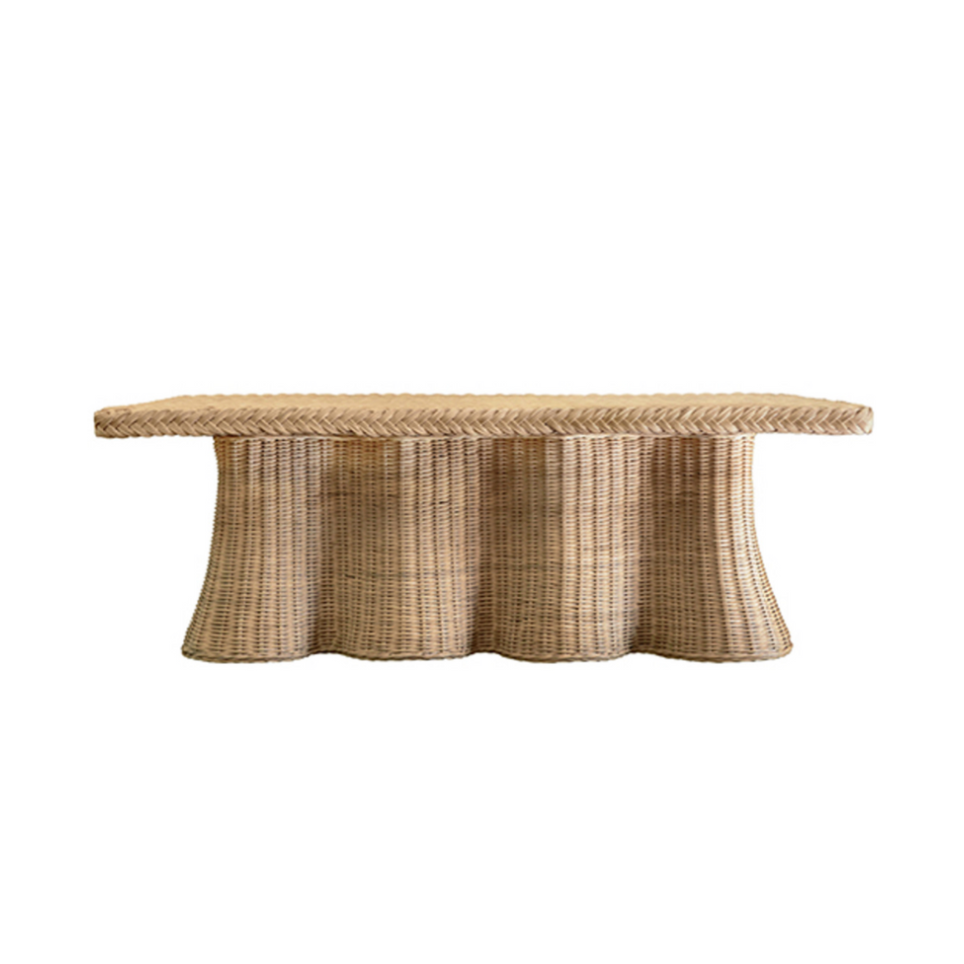 RECTANGULAR COFFEE TABLE WITH BRAIDED EDGE AND SCALLOPPED SKIRT IN NATURAL WOVEN RATTAN