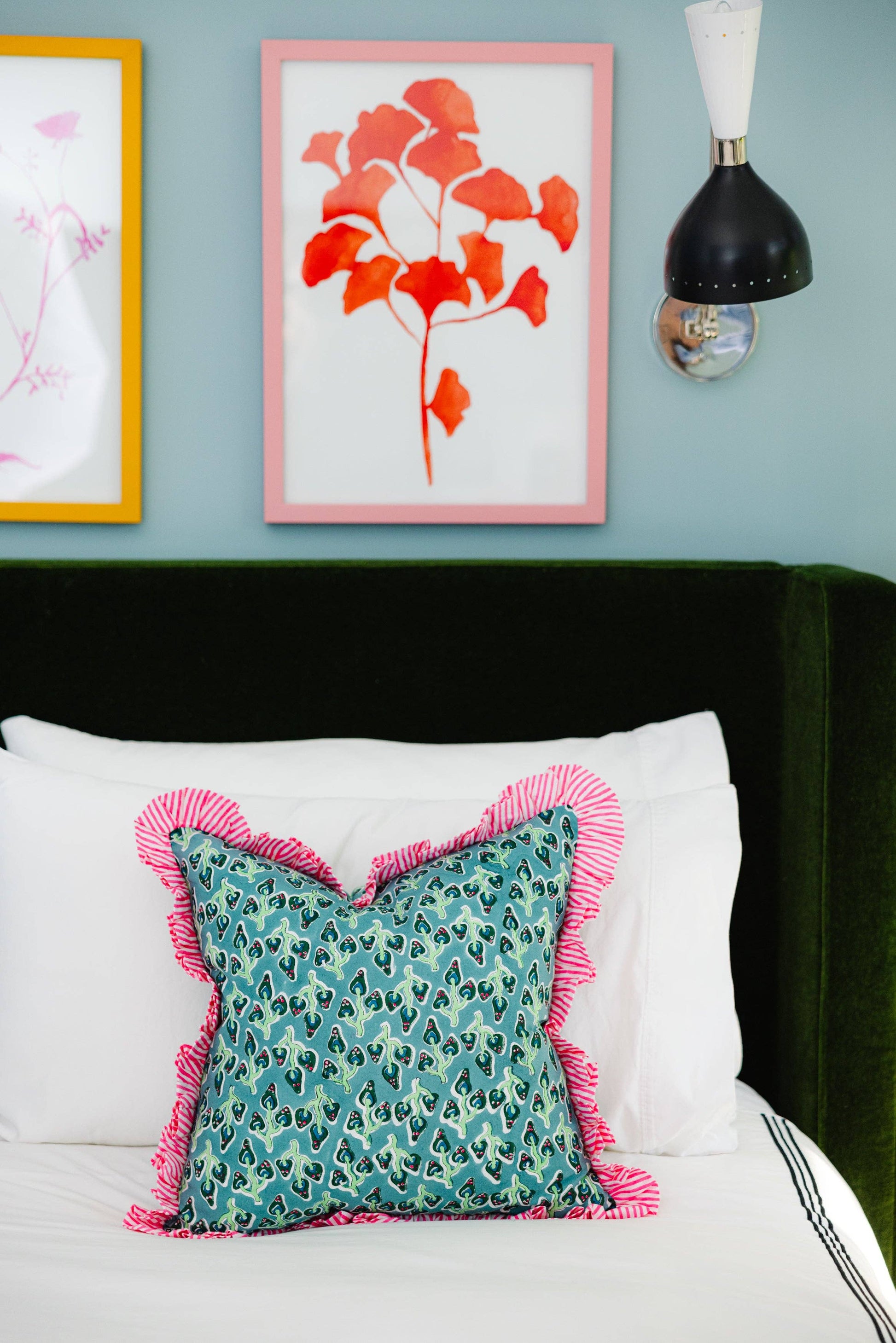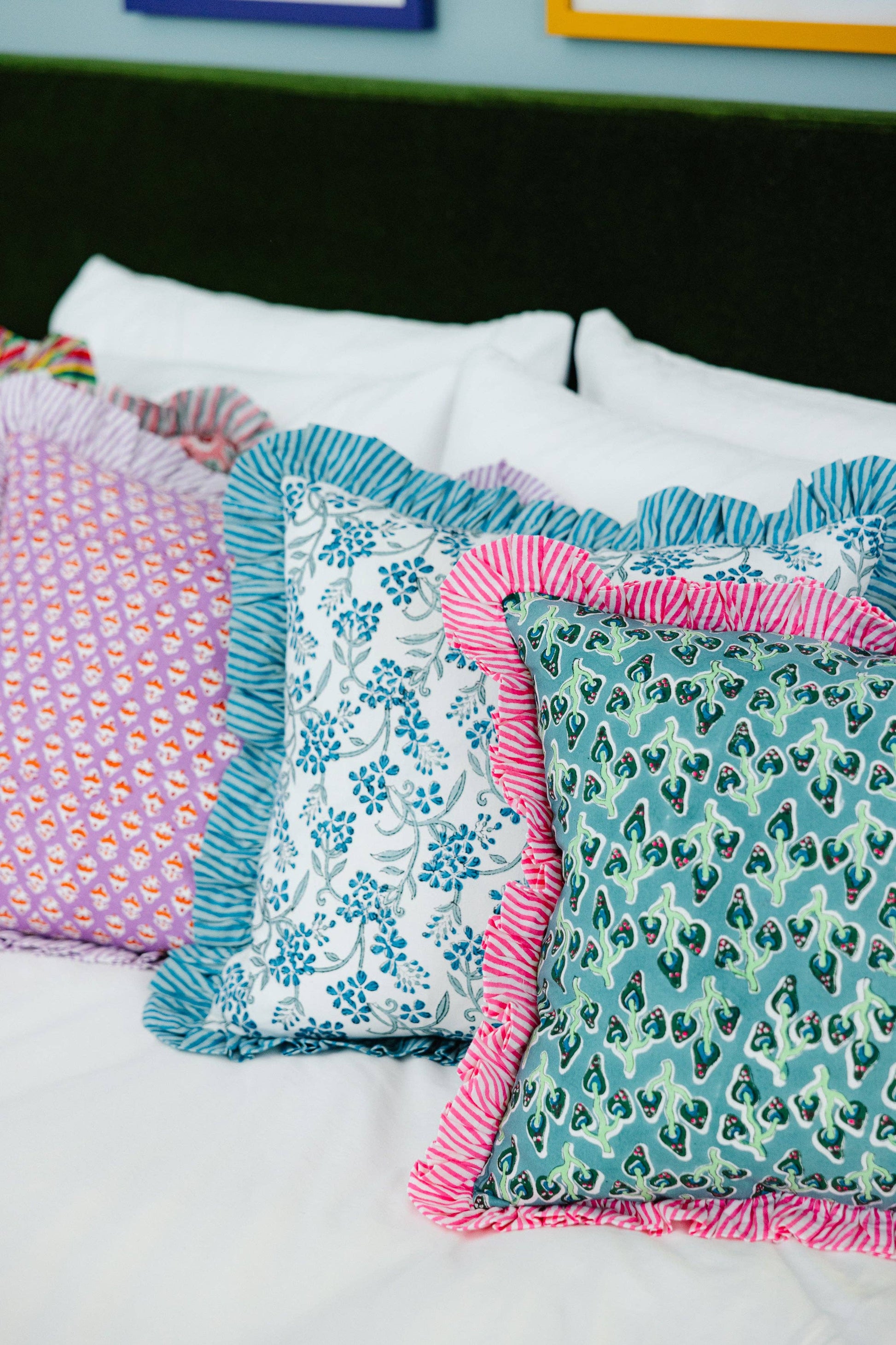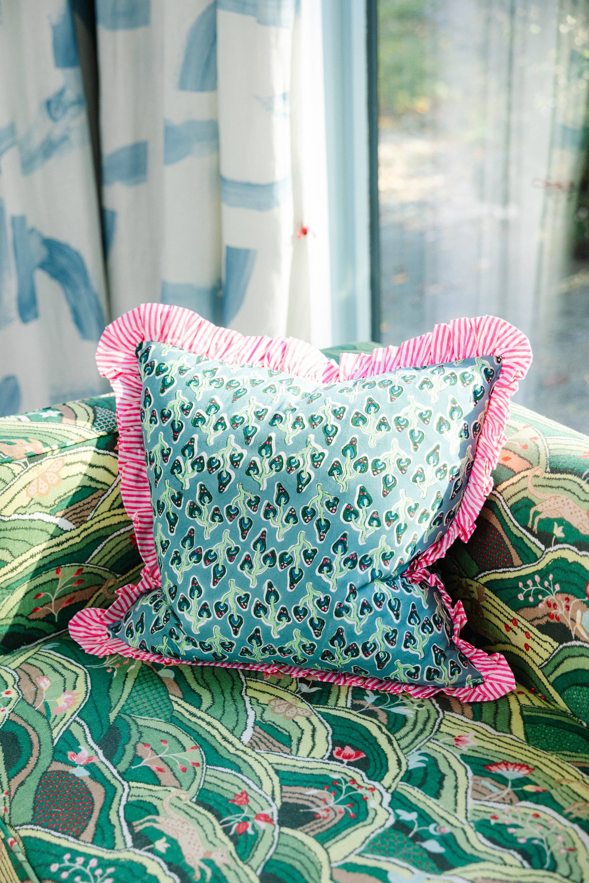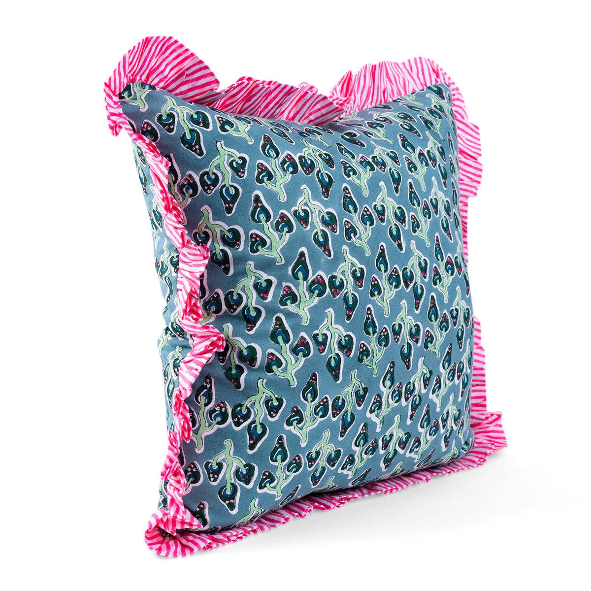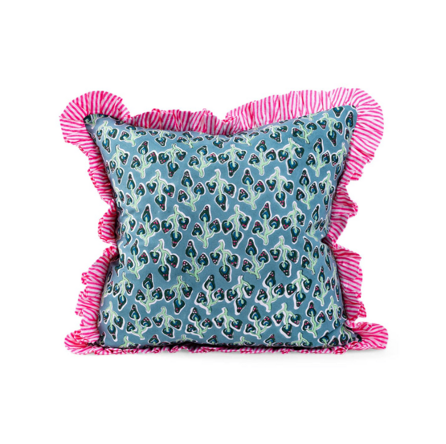 Hand printed in India, our bold blockprint pillows with ruffled edges are the perfect luxe layer to add to your mix. Bright colors with a contrast striped trim makes for a signature look. Includes a lush down alternative insert slightly larger than the pillow case to ensure a full stuff. Dare to mix with our scalloped linen, contrast trim velvet, ruffled block print, and needlepoint pillows for an insta-worthy pillow pile. -18" square pillow case with 2" ruffle -Made in India -Includes 20" square down alternative insert -100% Cotton, Cover: 50% polyester/50% cotton, Filling: 100% polyester. Hypoallergenic. -Hidden zipper; handle gently. Related Tags: ruffled throw pillow, decorative pillow, floral ruffle edge pillow, cushion, summer home decor, beach house vibes, summer styling, beach house decor, ruffle pillow, summer accent pillow, handmade throw pillow, floral pattern pillow, handmade square throw pillow, square throw pillow, living room accent